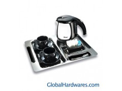 -304 stainless steel electric jug with matching tray -Tamper-proof power socket built into tray for added security against theft -Boils 1 cup of water in under 1 minute -1.0l water capacity large enough for 6 coffee cups -360 degree cordless system for left or right handed use -Auto switch-off -Boil dry and overheat protection -Elegant porcelain cups saucers and condiment holder -Concealed heating element for maximum hygiene and minimum cleaning