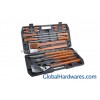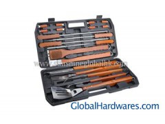 4pcs bbq skewers 4pcs corn holder 1pc spatula 1pc bbq tong 1pc brass wire brush 1pc bristle brush 1pc knife 1pc grill fork Material:stainless stell with wood handle Packing: each set in plastic case Feature:Easily cleaned, high temperature-resistant