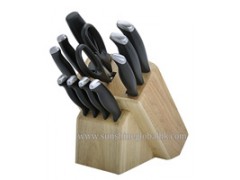 12 pcs kitchen knife set in stainless steel hollow handle with TPR cover Kitchn knife set: 1pc 8” chef knife 2.0mm 1pc 8” carving knife 2.0mm 1pc 8” bread knife 2.0mm 1pc 4.5” utility knife 1.8mm 1pc 3” paring knife 1.8mm 1pc scissors 1pc knife sharpener 4pcs 4.5” steak knife 1.8mm 1pc wooden stand