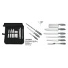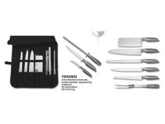 9Pcs Kitchen knives set ,hollow handles, bag packing Materials:stainless steel 3CR14, 600D packing bag Products' specification: 8"chef knife,thickness 2.7mm 7"vegetable knife,thickness 2.7mm 8"Meat cleaver,thickness 2.7mm 6" bone knife,thickness 2.2mm 5" utility knife,thickness 1.7mm 3.5" paring knife,thickness 1.7mm 15-1/2" ham knife 8" knife sharpener, 600D packing bag