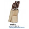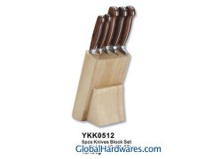 5pcs Knife Block Set Material: Knives: 3Cr13 stainless steel blade, color wood handles with forged head Kitchenwares: Nylon, PP handle Rubber wood choping board and block Product specifications: 8" chef knife x 1: 2.5mm thickness 8" meat cleaver x 1: 2.5mm thickness 6" boning knife x 1: 2.0mm thickness 6" utility knife x 1: 2.0mm thickness 3.5" paring knife x 1: 1.5mm thickness Packing: 1set/rubber wood block, 1block/white box