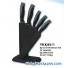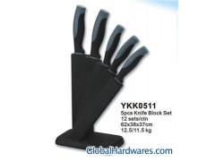 5pcs Knife Block Set Material: 2Cr13 stainless steel blade, PP/rubber handles, pine block. Product specifications: 8" chef knife x 1 8" meat cleaver x 1 6" utility knife x 1 5" steak knife x 1 3.5" paring knife x 1 Knives thickness: 1.5mm Packing: 1set/block, 1block/white box