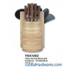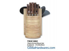 10pcs Knife Block Set Material: Knives: 3Cr13 stainless steel blade, color wood handles with forged head Kitchenwares: Nylon, PP handle Rubber wood choping board and block Product specifications: 8" chef knife x 1: 2.5mm thickness 8" meat cleaver x 1: 2.5mm thickness 6" boning knife x 1: 2.0mm thickness 6" utility knife x 1: 2.0mm thickness 3.5" paring knife x 1: 1.5mm thickness 31.5cm nylon kitchenwares x 5 Chopping board x 1:28*18.5*1.5cm Packing: 1set/rubber wood block, 1block/white box