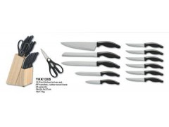 12 Pcs Kitchen knives set ,PP handles, rubber wood base Materials:stainless steel 2CR13 Products' specification: 8"chef knife,thickness 1.5mm 8"Meat cleaver,thickness 1.5mm 8"bread knife,thickness 1.5mm 6" bone knife,thickness 1.5mm 3.5: paring knife,thickness 1.2mm 4.5" steak knive ×6, thickness 1.5mm kitchen scissor,20.5cm,thickness 1.5mm