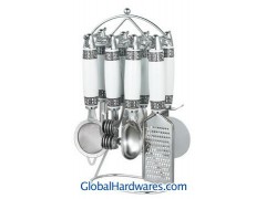 Set includes: can opener, peeler, bottle opener, ice-cream spoon, pizza cutter, tea strainer, knife sharpener and stand. Material: ABS handle + 18/0 stainless steel. With SGS, FDA and LFGB food testing marks. Different handles and colors are available.