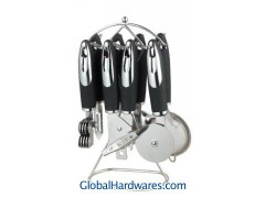 Set includes: can opener, peeler, bottle opener, ice-cream spoon, pizza cutter, tea strainer, knife sharpener and stand. Material: ABS (with rubber finish) handle + 18/0 stainless steel. With SGS, FDA and LFGB food testing marks. Different handles and colors are available.