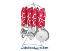 Set includes: can opener, peeler, bottle opener, ice-cream spoon, pizza cutter, tea strainer, knife sharpener and stand. Material: ABS handle + 18/0 stainless steel. With SGS, FDA and LFGB food testing marks. Different handles and colors are available.