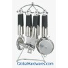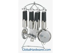 Set includes: can opener, peeler, bottle opener, ice-cream spoon, pizza cutter, tea strainer, knife sharpener and stand. Material: ABS (with rubber finish) handle + 18/0 stainless steel. With SGS, FDA and LFGB food testing marks. Different handles and colors are available.