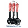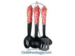Set includes: one for each soup ladle, skimmer, slotted turner, spoon,slotted spoon, spaghetti server and stand. Material: ABS handle + nylon. Heat resistance up to 210°C, With SGS, FDA and LFGB food testing marks. Different handles and colors are available.