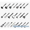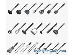 Set includes: soup ladle, skimmer, turner,fork, slotted turner, spoon, slotted spoon,spaghetti server,whisk,potato masher,small spoon,butter knife,bread tongs. Material: nylon. Heat resistance up to 210°C, With SGS, FDA and LFGB food testing marks.