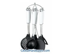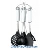 Set includes: soup ladle, skimmer, turner, slotted turner, spoon, slotted spoon and stand. Material: ABS handle + 18/0 stainless steel and nylon. Heat resistance up to 210°C, With SGS, FDA and LFGB food testing marks. Different handles and colors are available.