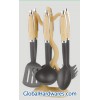 Set includes: one for each soup ladle, skimmer, slotted turner, spoon,slotted spoon, spaghetti server and stand. Material: ABS (wooden color) handle + nylon. Heat resistance up to 210°C, With SGS, FDA and LFGB food testing marks. Different handles and colors are available.