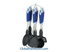 Set includes: soup ladle, skimmer, turner, slotted turner, spoon, slotted spoon and stand. Material: ABS (with rubber finish) handle + 18/0 stainless steel and nylon. Heat resistance up to 210°C, With SGS, FDA and LFGB food testing marks. Different handles and colors are available.