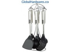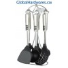 Set includes: soup ladle, skimmer, turner, slotted turner, spoon, slotted spoon and stand. Material: 201 stainless steel handle + 18/0 stainless steel and nylon. Heat resistance up to 210°C, With SGS, FDA and LFGB food testing marks. Different handles and colors are available.