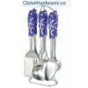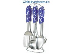 Set includes: one for each soup ladle, skimmer, fork, slotted turner, spoon, spaghetti server and stand. Material: ABS handle + 18/0 stainless steel. With SGS, FDA and LFGB food testing marks. Different handles and colors are available.