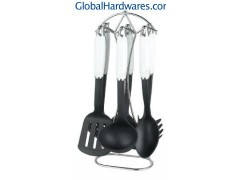 Set includes: one for each soup ladle, skimmer, slotted turner, spoon,slotted spoon, spaghetti server and stand. Material: ABS handle + nylon. Heat resistance up to 210°C, With SGS, FDA and LFGB food testing marks. Different handles and colors are available.