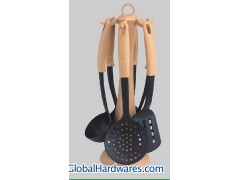 Set includes: one for each soup ladle, skimmer, slotted turner, spoon,slotted spoon, spaghetti server and stand. Material: ABS handle(wooden color) + nylon. Heat resistance up to 210°C, With SGS, FDA and LFGB food testing marks. Different handles and colors are available.
