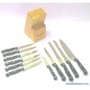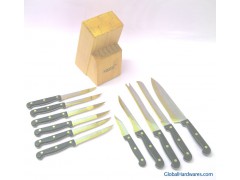 S/S Blade with Titanium Plated 1 x 8" Chef's Knife 1.5mm 1 x 8" Beard Knife 1.5mm 1 x 8" Frozen Meat Knife 1.5mm 1 x 5.75" Boning Knife 1.5mm 1 x 3" Paring Knife 1.2mm 6 x 4.75" Steak Knife 1.2mm Packing : Color Box