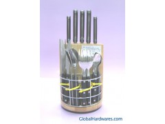 Cutlery : 1x4PCS Dinner Spoon 1.5mm 1x4PCS Dinner Fork 1.5mm 1x4PCS Dinner Knife 1.5mm 1x4PCS Tea Spoon 1.2mmCutlery Handle Material : Bakelite/Mirror FinishKnife: 1 x 8" Chef Knife 1.5mm 1 x 8" Bread Knife 1.5mm 1x 8" Slicer 1.5mm 1x 5" Utility Knfie 1.2mm 1 x 3.5" Paring Knife 1.2mm Wooden Block-Rubber WoodKnife Handle Material : BakelitePacking: PVC BOX