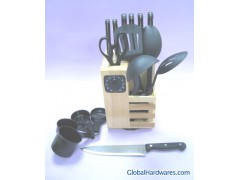 7pcs Bakelite Handle Knfie & Fork1 x 8"Chef's knife 1.5mm1 x 8"Bread knife 1.5mm1 x 8"Slicer knife 1.5mm1 x 6"Boning knife 1.5mm1 x 6"Meat Fork 1.5mm1 x 5" Utility knife 1.2mm1 x 3.5"Paring knife 1.2mm1 x 8" Scissor 2.0mm4 x 1 PP Handle Kitchen Tools10 x 1 PP Handle Measurement cup1 Pc timer1Rubber wooden block