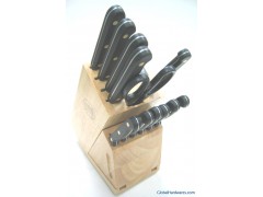 S/S Blade with Titanium Plated 1 x 8" Chef's Knife 1.5mm 1 x 8" Frozen Meat Knife 1.5mm 1 x 8" Beard Knife 1.5mm 1 x 5.75" Boning Knife 1.5mm 1 x 3" Paring Knife 1.2mm 6 x 4.75" Steak Knife 1.2mm 1 x 8.5" Scissor 1.8mm 1 Rubber Wood Block with Sharpener Packing : Color Box