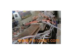 Wood plastic profile extrusion line This production line is composed of conical twin-screw extruder, vacuum shaping table, haul off, cutter and piling frame, and also coordinated with different profile break-section and mould to produce wood plastic door&window profiles, wood plastic profile, wood plastic profile plate.Line model YF 180 YF240 YF300 Max material width(mm) 180 240 300 Auxiliary main power(kw) 18.7 27.5 33.1 Cooling water capacity(M3/H) 5 7 7 Compressed air pressure(MPA) 0.6 0.6 0.6