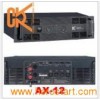 Product Description AX-Series are 2 channels post power amplifiers which adopt excellent round-transformer and high efficiency amplifier output circuit. No matter considering from sound quality or power handling, it meets the needs of all kinds of loudspeakers. With good radiating system, it can work safely for a long time. AX-Series are of high performance in its stability, ultra low noise, complete protection against DC, overheating, short circuit, clipping, distortion and so on. APPLICATIONS Club installations Live performances Theater installations FEATURE Good transient response High reliability, high durable Superior sonic performance Adopt advanced protection circuits Model AX-12 8Ω Stereo Power 1300W× 2 4Ω Stereo Power 1800W× 2 8Ω Bridged Monon 3600W 4Ω Bridged Monon 4600W Frequency response 20Hz-25kHz ± 0.5dB THD+N(Rated Power, 4Ω /kHz)% 0.03%@1kHz Signal Noise Ration(dB) 102dB Input Impedance 22K Ohm Balanced/11K Ohm Unbalanced Power Requirement 200-240V/50-60Hz Input Sensitivity 1V/1.5V Airframe Dimension 483× 481× 133mm Package dimensions 570× 565× 210mm Net Weight 38.5kg Gross weight 41.5kg