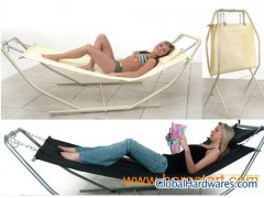 Outdoor Folding Hammock Products information: Product Dimension: 225(L)x63(W)x98(H)CM Material: Steel Φ 38x1.1 mm /25x1 mm Fabric: Polyest 200x92cm Weight capacity: 130kgs Type: Powder Coated Steel Carton size: 105x19x30.5cm N. W/G. W: 15/16kgs