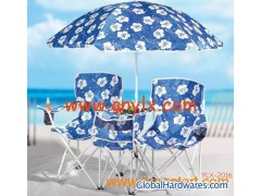 Home Furniture Umbrella Table/Cooler & Two Jumbo Chairs with Rolling Tote. This oversized version of our popular Beach Set features two 24 "Wx38"H chairs that support up to 500 lbs. Each. Same great 64 "Hx57"Diam. Umbrella and center table with insulated cooler. Steel frame folds into a 2-wheel tote with handle. Khaki poly canvas. Open size for single chair: 60*53*96cm Umbrella Size: Dia147*160CMH Center table with insulated cooler Materials: Chair Tube: 16*0.8mm steel; Fabric: 600*300D Oxford polyester, PVC Packaging: Each chair and table set put in a carrying bag and then with umbrella in a Standard export brown carton.