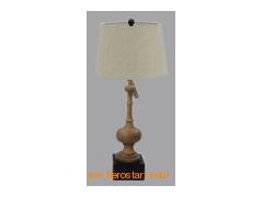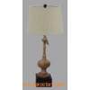 Solid wood table lamp, Light brown wood finish with matt back base. Round hardbackshade in beige linen fabric, size in 11.5*14*9"H. No trim no piping. Clear cord, 3-way 100W