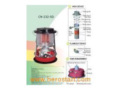 Product's Name: KEROSENE HEATER Model: CN-232-SD Automatic Shut-off device Packing: 1PC/CTN Measurement: 32.5*32.5*44.0CM G. W/N. W: 4.4/5.1kgs Tank Capacity: 2.5L Fuel Consumption: 0.2-0.24L/Hr Heater Output: 6300-7500BTU/Hr Continues Heating Duration: 10-12hr Container Capacity: 1510PCS/40HQ Chimney Type: Metal/Glass Tank System: Triple