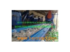 PET bottle washing machine 1. Bale opener 1Set Open the baled PET bottles into individual bottles, controlled by inverter 2. Small manual sorting belt 1 set Simply pick out the steel wires, films or other big impurities. 3. Belt conveyor 1 Set Delivery bottles to the pre-washing machine. 4. Pre-washing machine 1 Set Peeling the 90% labels and 50% caps of the bottles, washing the bottles by cold water. Clean bottles will be convenient for manual sorting and it will be more efficient to increase the capacity of the crusher. 5. Manual sorting belt 1Set The belt length is 6 m, the workers separate different color bottles and non-PET materials. It's equipped with metal detector. 6. Crusher 2 Set This crusher is designed for wet crushing. It is equipped with eight rotating and four stationery knives. Crusher is supplied with standard grid size of 12mm and spare grid of 10 mm(Custom made). 7. Screw conveyor 1 Set Transport flakes to the hot washing. 8. Hot water washing chamber 2Set Washing the flakes from labels, dirt and other residues by water heated to 85 ° C. Overflow on top of washing chamber, remove cups and rest of the paper. The water heated by steam from steam boiler, or burn the water directly from the bottom by oil or gas. 9. Friction washing tank 1Set The flakes are efficiently cleaned insight in drum with blades on rotor turning 1, 200RPM. Flakes are rubbing against each other as well as against the rotating auger. The auger moves the flakes forward and clean last remains of dirt. 10. Floating washing tank 2 Set Flotation/sink tank separate the material according to their density. PET sinks to the bottom and is discharged by a screw conveyor. Remains of caps and rings made of PE and labels of PP float on the top and are moved by rotating shovels to side of washing tank. Small screw conveyor takes them out. 11. Centrifugal dryer 1Set The wet flakes are dewatered in horizontal centrifuge. Flakes are dry to 2.5% of humidity. 12. Drying bunker 1Set Drying the flakes by electricity of 11kw, 2000L storage silo has fan blower conveyor filling station to the big bags 13. Electrical control systems 1 Set Whole line is controlled via two main control boxes and two panels. Switch to each machine on the panel, plus frequency control display. 14. Water sewage plant: Complete water sewage plant to Recycle and reclaim of sludge Capacity: (Bottles in) 500kg/hr, 1, 000kg/hr and 2, 000kg/hr, 3000kg/hr Moisture of final flakes: Less than 1.5%.