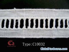 Embroideried lace: #c10032model no:#c10032composition :cotton100%moq: the basis of customers demand price terms: FOB FUZHOU CHINApayment terms: T/T ,WESTERN UNION,L/Cpacking: BY CORTONSWe manufacturer and export all types of Lace: Elastic lace, Non-elastic lace, Eyelash lace ,Cotton lace, Tricot lace, T/C lace, lace Trimmings, lace Fabric,The product widely is suitable for the feminine clothing, the underwear, the chest measurement the nuptial dress, the children clothing, bed wrap, window blind, sock, umbrella, toy, ect. our products are top quality ,competitive price ,can be dyed different color as your request,Sincere service for long business relationship