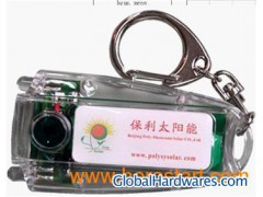 Solar Panel:5.5V/10MA non-crystalline Power Source:6PCS super bright low power white LED lamp luminance:10000-12000MCD power source:3 pcs button cells mark customer's Logo by silk-screen,portable,work as key ring
