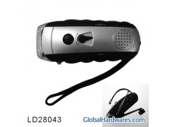 Detailed Product DescriptionName: radio crank flashlightItem no.: Type: LD28043Specification: SpecificationMaterial: PlasticDescription:1. with 3 ultra bright LEDs and radio function. 2. Cranked 1 minute, it can illuminate for about 40 minutes. 3. Supply power for mobile phone and radio. It can choose radio band (FM/AM)4. Placed for a year, it generates electricity by winding-up, and still works normally.5. Ideal tool for family life and outdoor activities, especially emergency. 6. Energy saving and no pollution. 7. Environmentally friendlyBuilt-in lithium cell: 3.6V / 120 m A.Packing: Blister, 48 pcs/ ctn. (4 inner box).Carton Dimension: 48X36X49 cmG.W: 15 kgN.W: 10kg