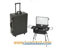 Sleek, all black exterior with black trim and black corners Constructed of high quality, durable aluminum edges, reinforced steel corners, and durable aluminum panels Heat-resistant exterior protects your valuable tools and cosmetics Easily transport using dependable in-line wheels and retractable telescoping handle Four spacious padded trays tier outward for convenience and functionality Secure your belongings with a lock and key 110-240 Volts Circuit - Auxiliary power outlets Mirror includes six - LED lights bulbs Four telescoping legs can be adjusted to your specific height: Maximum height 32.5" Overall Closed Dimensions: 27" L x 19" W x 10" H