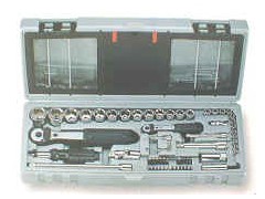 2-BOX TYPE RATCHET HANDLE W/ QUICK REVERSIBLE BUTTONS: 1/2" & 1/4" 12-1/4"DR. SOCKET:4,4. 5,5,5. 5,6,7,8,9,10,11,12,13 mm 13-1/2"DR. SOCKET:14,15,16,17,18,19,20,21,22,24,27,30,32 mm 1-REVERSIBLE SCREWDERIVERS HANDLE 1-BLOW CASE W/ EXTRA STORAGE CAB