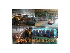 *** Five-wheel type continuous casting machine is composed of crystallizing wheel, pressing pulley, tension pulley, guiding wheel, casting ladle, cooling device, steel belt drying device, dust removing and carbon coating device, ingot-picking up device, pulling machine, throttle, pneumatic control system and so on. (The extra automatic casting system can be equipped according to user's requirement). The five-wheel continuous casting machine is produced by the patent technique(Patent No.: ZL00244512.3), which, on one hand, protects casting bars coming from the casting machine from meeting steel belts, so that the bars can be sent into the rolling mill directly without reversing the angles. On the other hand, the crystallizing wheel is of "H" shape, and the cooling methods include controllable inner cooling, outer cooling, side cooling and partly water cooling, and stainless steel is adopted in all the methods. The adjusting valve is equipped respectively in order to automatically control the water flow while casting. The big cooling section and good cooling effect ensure the crystal of smelted copper close and equal while being cast. The five-wheel continuous casting machine has five wheels on the same plane, which is convenient for installation. Level casting can make smelted copper flow to the crystallizing wheel smoothly. There are two casting ladles, and the upper one controls the flow to be cast to the small lower one. The pneumatic steel belt tensioning and mechanical pressing are adopted to ensure the continuously adjustable tension and pressure. Add to Basket
