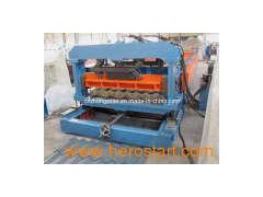 Components for the Machine The Roof Tile Forming Machine includes in mechanical decoiler, sheet guiding equipment, covering film device, roll forming system, pressing equipment, post-cutting equipment, hydraulic station, electric controlling system and supporter for product. Technical Parameters Suitable material color steel sheet Coil width 1219mm Yield strength 37Ksi Thickness 0.5mm, 0.6 mm Step distance range 250mm-350mm Working Speed about 2.0 m/min. (including in cutting & pressing time) Forming Speed about 15m/min for ZYYX25-143-1001 roll forming machine (excluding in cutting time) Power Requirement Main motor power: 5.5 Kw (Depend on final design) Hydraulic station power: 5.5Kw (Depend on final design) Mechanical decoiler Max. Capacity: 5000kgs Control system Mitsubishi PLC and converter Type of cutting after roll-formed and length-set cutting Electric condition 380V/3P/50Hz Machine Dimension About 16000× 1800× 1400mm