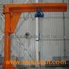 This kind of crane is developed in recent years, small and medium-size lifting equipment, safe, reliable, high efficiency, energy-saving, time-saving and labor-saving and flexible feather, in the three-dimensional space and can operate freely, especially in the short, intensive lifting showing the occasion better than any other conventional lifting equipment unique advantages, widely used in workshops, warehouses, terminals and other fixed location. Features: This machine suitable to work in the dock, warehouse, workshop etc fixed working conditions, it can work within the 360 degrees to lift, move and materials handling. This type machine is composed by the vertical shaft, revolving arm, rotating shaft, hoist etc, the bottom of the vertical shaft is fixed on the concreate base. Horizontally rotation of the revolving arm: Manual, depend on the operator use the human force to push the impending working or self prepared rope etc device, the hoist travel with the right and left straight line on the H beam, use the hoist to lift the heavy materials. This type machine with advantages of the simple structure, operate convenience, turning agile, wide working conditions.