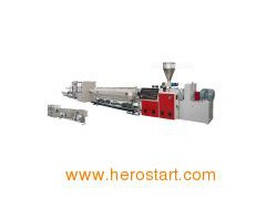 PVC pipe extrusion line: 1. Max diameter: 800mm 2. Max capacity: 750kg/h 3. Certificate: CE, ISO 4. Extruder: Single screw GF series plastic pipe material production line is mainly used in the area of agricultural water supply system, architectural water supply system, pavement of cables, etc, as well as PVC pipe material of all sorts of pipe caliber and wall thickness. This machine group consists mainly of twin conical (parallel) screws extruder, vacuum calibrating tank, haul-off unit, cutting unit, tilter, etc. Single screw extruder and haul-off unit have applied imported A/C inverter, both vacuum pump and driving motor have applied excellent products, the drawing machine includes two-claw type, four-claw type, eight-claw type, etc. Saw cutting and planet cutting can be applied. It is additionally applied with length measuring meter and thickness increasing device, the property of machine group is reliable, the production efficiency is high.